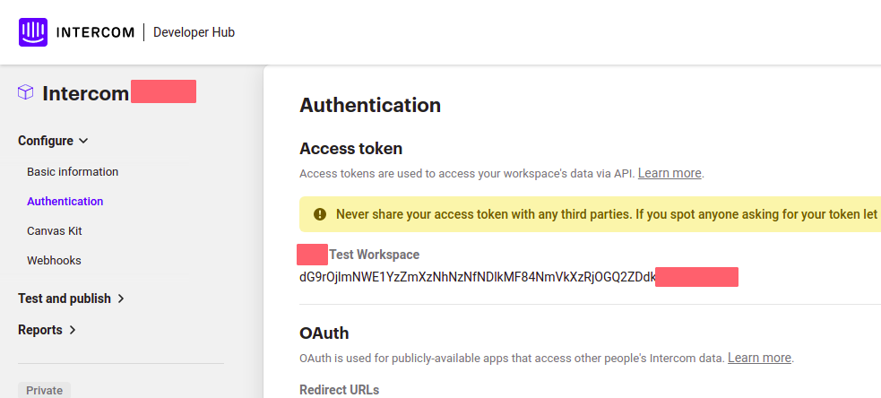 - Intercom Access token: Copied earlier from the Intercom Developer Hub.