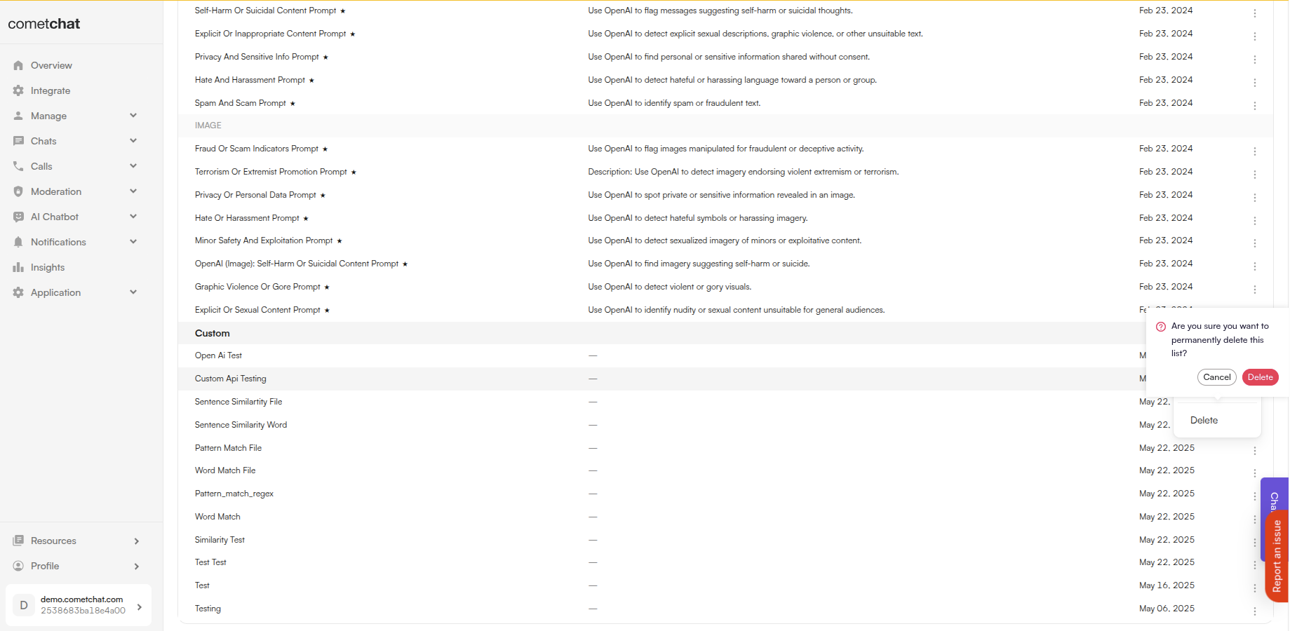 Login to CometChat Dashboard → Select your app → Moderation → Settings → Lists