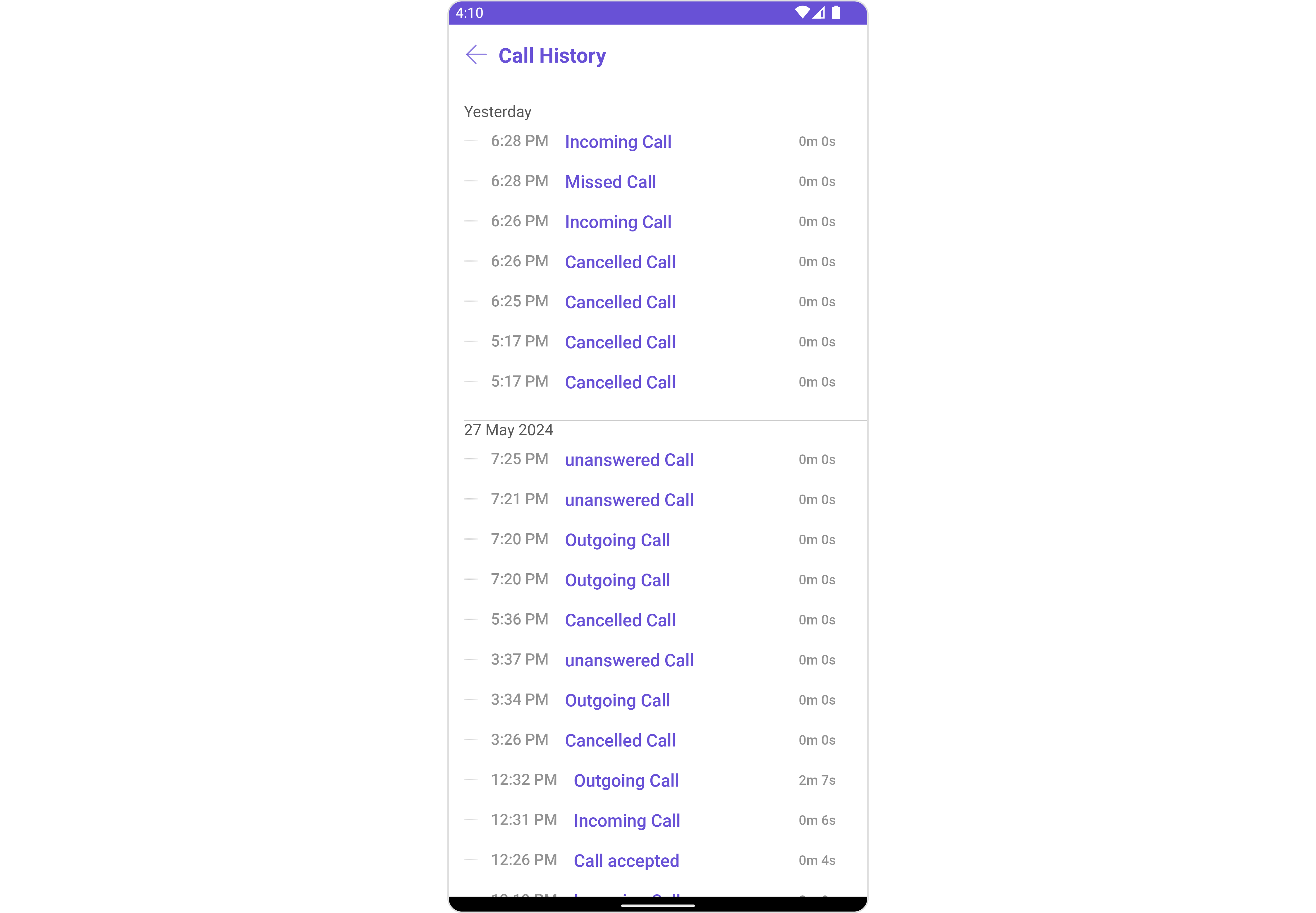 The CallLogRequestBuilder enables you to filter and customize the call list based on available parameters in CallLogRequestBuilder. This feature allows you to create more specific and targeted queries during the call. The following are the parameters available in CallLogRequestBuilder- Java
