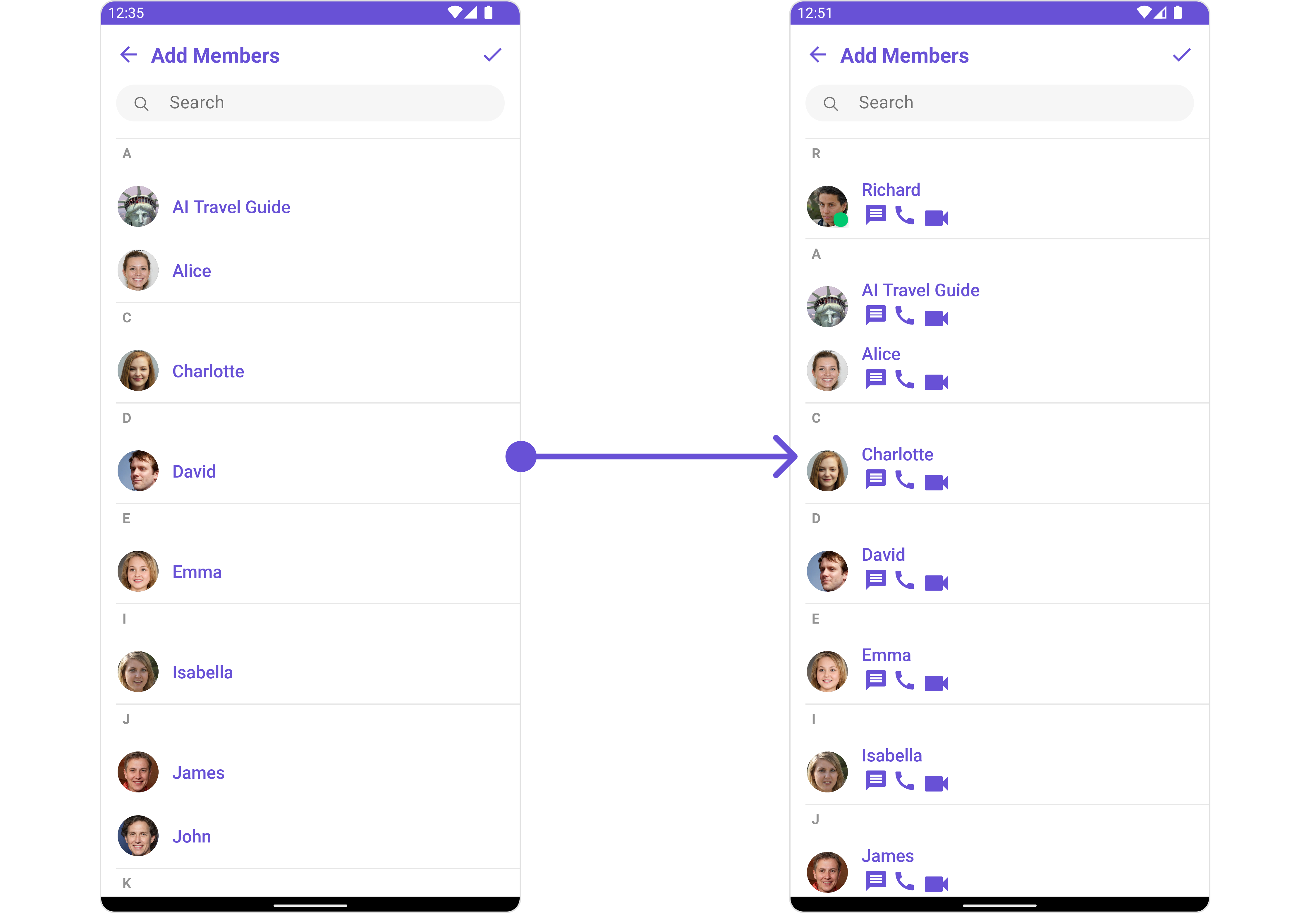 | Property | Description | Code | | --------------------------- | ----------------------------------------------------------------------------------------------------------------------------------------------- | ------------------------------------------------ | --- | | Group | The group to which the users selected will be added. A required parameter. | .setGroup(Group) | | Title | Used to set title in the app bar | .setTitle(String) | | Style | Used to set styling properties | .setStyle(AddMembersStyle) | | Avatar Style | Used to customise the Avatar of the group member | .setAvatarStyle(AvatarStyle) | | Status Indicator Style | Used to customise the status indicator shown if a group member is online | .setStatusIndicatorStyle(StatusIndicatorStyle) | | Search Placeholder Text | Used to set search placeholder text | .setSearchPlaceholderText(String) | | Back Icon | Used to set back button icon | .backIcon(@DrawableRes int res) | | Show Back Button | Used to toggle visibility for back button | .showBackButton(boolean) | | Search Box Icon | Used to set search Icon in the search field | .setSearchBoxIcon(@DrawableRes int res) | | Hide Search | Used to toggle visibility for search box | .hideSearch(boolean) | | Hide Error | Used to hide error on fetching users and failing to add selected users to the group. | .hideError(boolean) | | Hide Separator | Used to hide the divider separating the user items | .hideSeparator(boolean) | | Hide Section Separator | Used to hide the text separating grouped user items | .hideSectionSeparator(boolean) | | Disable Users Presence | Used to control visibility of user indicator shown if user is online | .disableUsersPresence(boolean) | | Selection Icon | Used to override the default selection complete icon | .setSelectionIcon(@DrawableRes int res) | | Submit Icon | Used to override the default selection complete icon | .setSubmitIcon(@DrawableRes int res) | | Selection Mode | Used to set the number of users that can be selected. By default it is SelectionMode.multiple. SelectionMode can be single, multiple or none. | .setSelectionMode(SelectionMode) | |