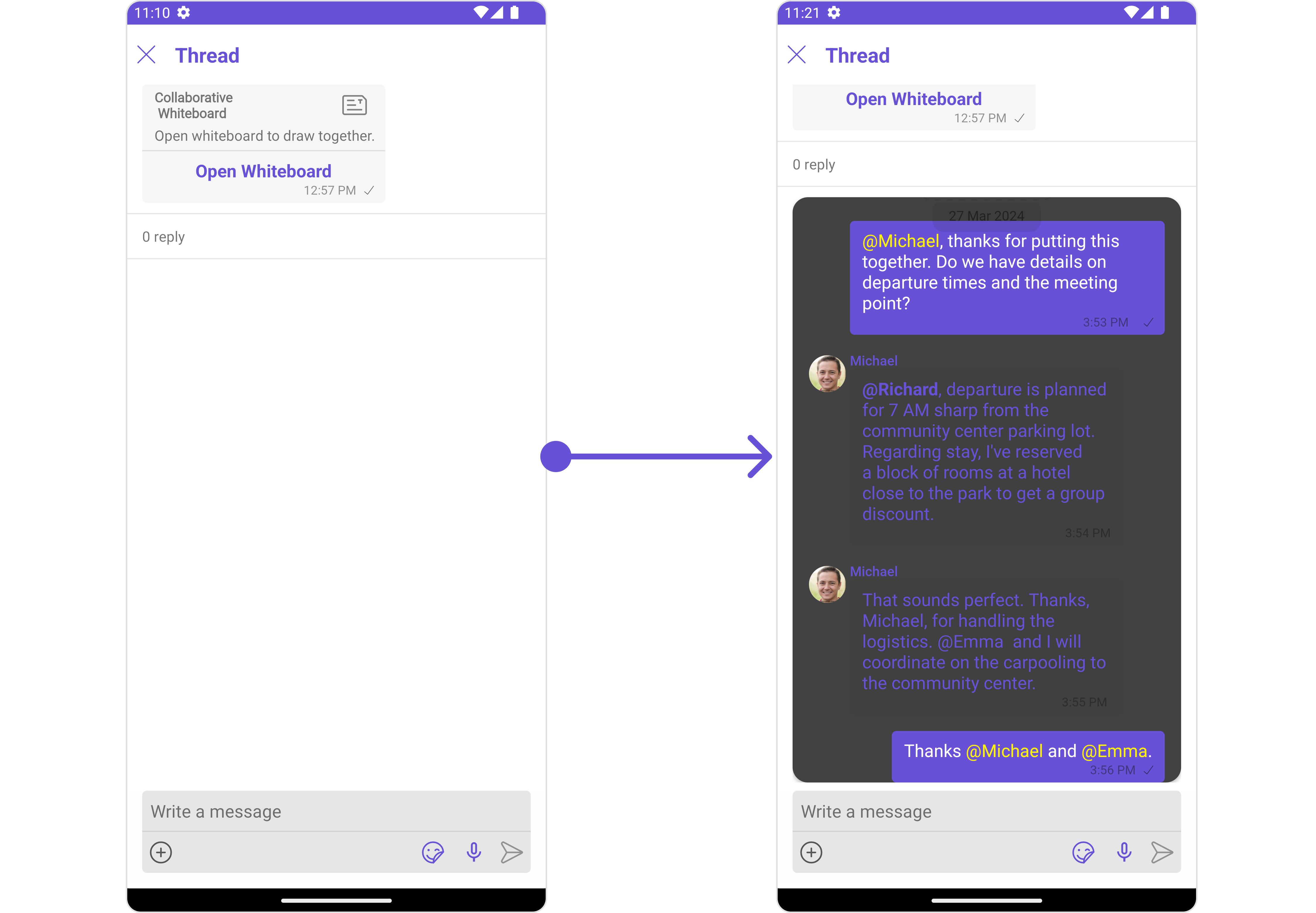 Actions dictate how a component functions. They are divided into two types: Predefined and User-defined. You can override either type, allowing you to tailor the behavior of the component to fit your specific needs. ThreadedMessages does not have its own actions. However, you can override the behavior of the ThreadedMessages component by using the actions of its Components, with the help of Configurations. Example In this example, we are overriding theonThreadReplyClick of the MessageList Component using MessageListConfiguration and applying it to ThreadedMessages.