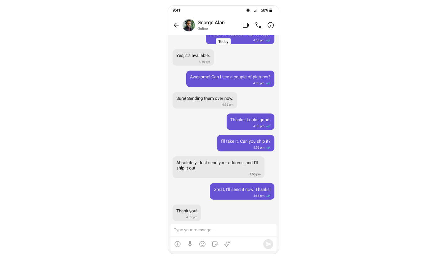 Best for: When a user lands directly into a chat screen, bypassing the conversation list. Highlights:- Single Screen Chat – Use