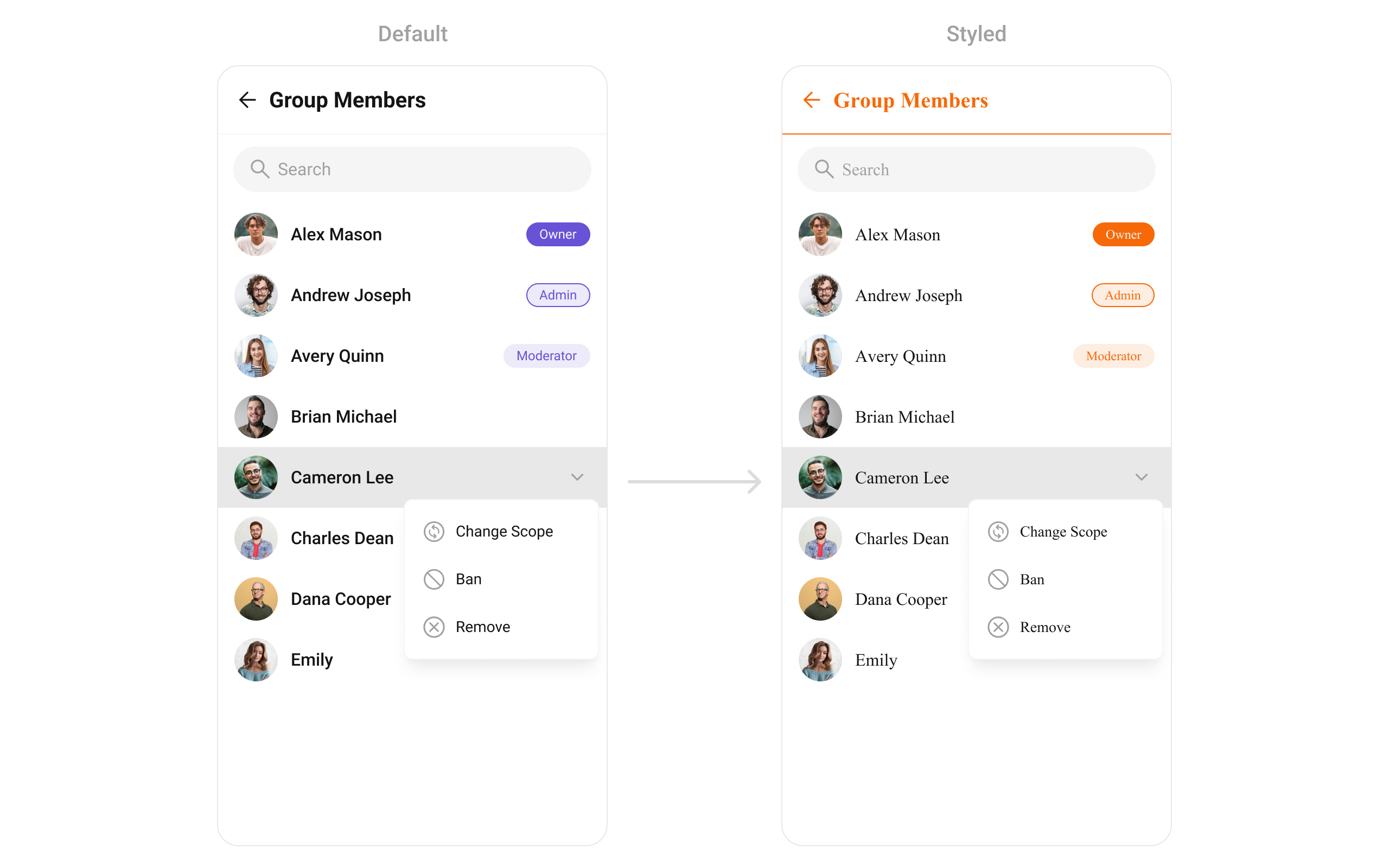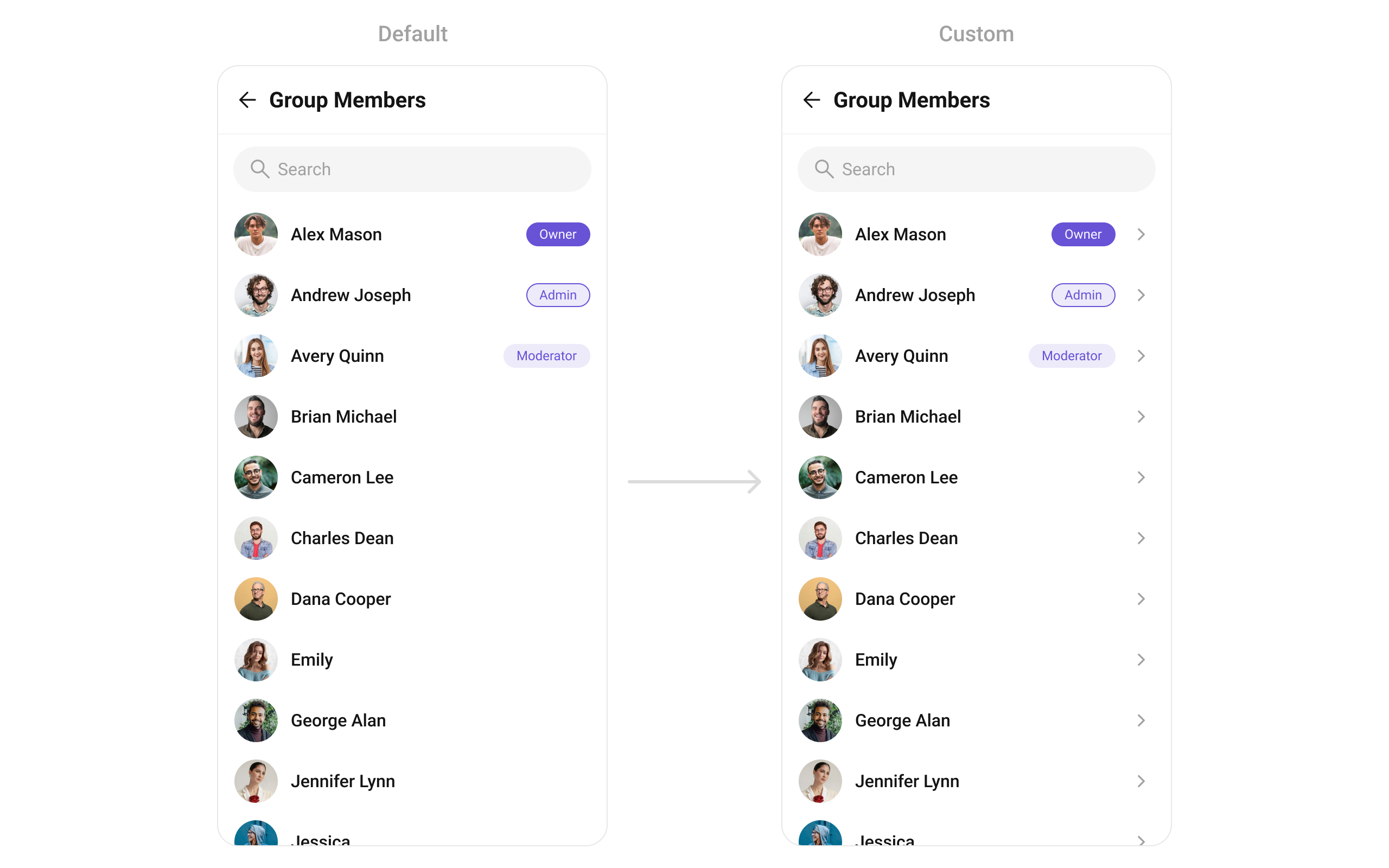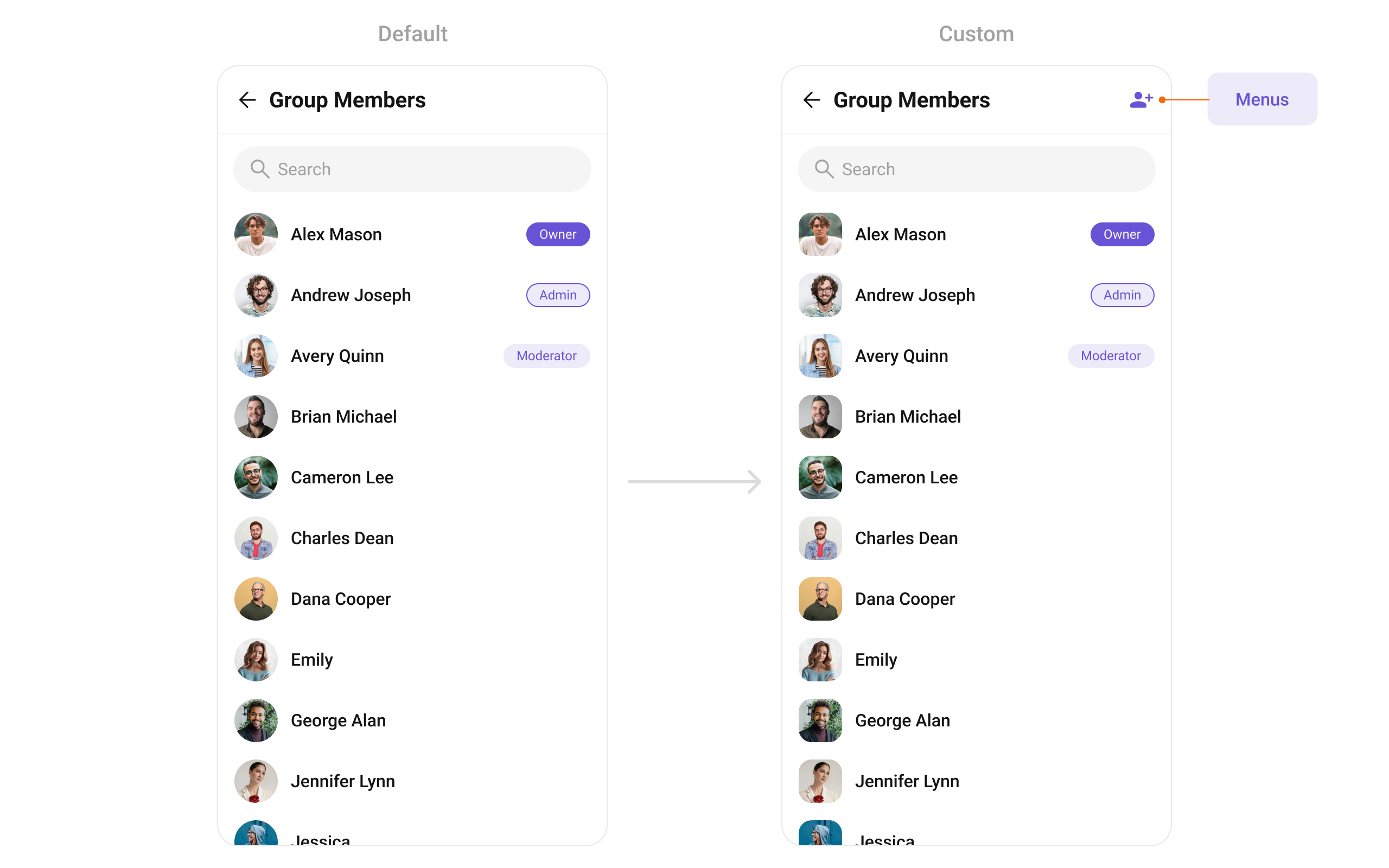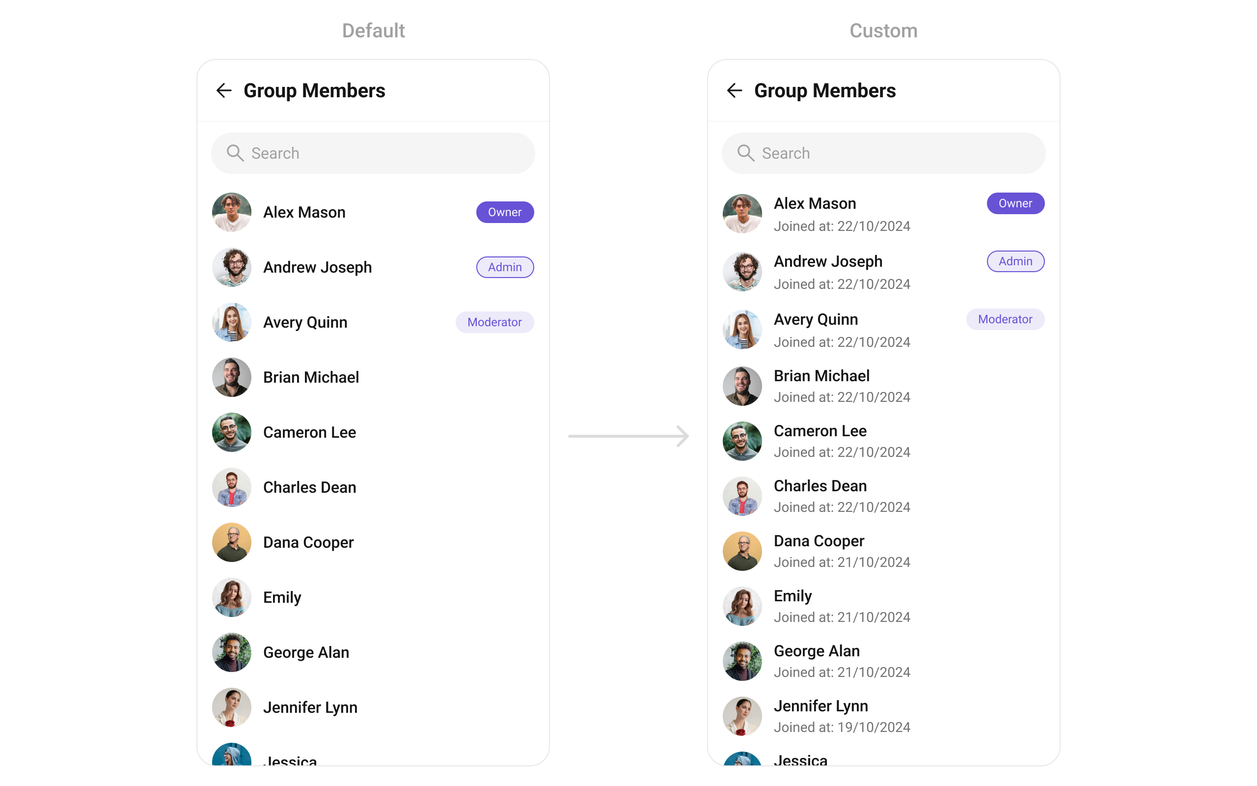 The GroupMembersProtocol uses GroupsRequestBuilder enables you to filter and customize the search list based on available parameters in GroupsRequestBuilder. This feature allows you to keep uniformity between the displayed Group Members List and Searched Group Members List. Here is the complete example for reference: Example