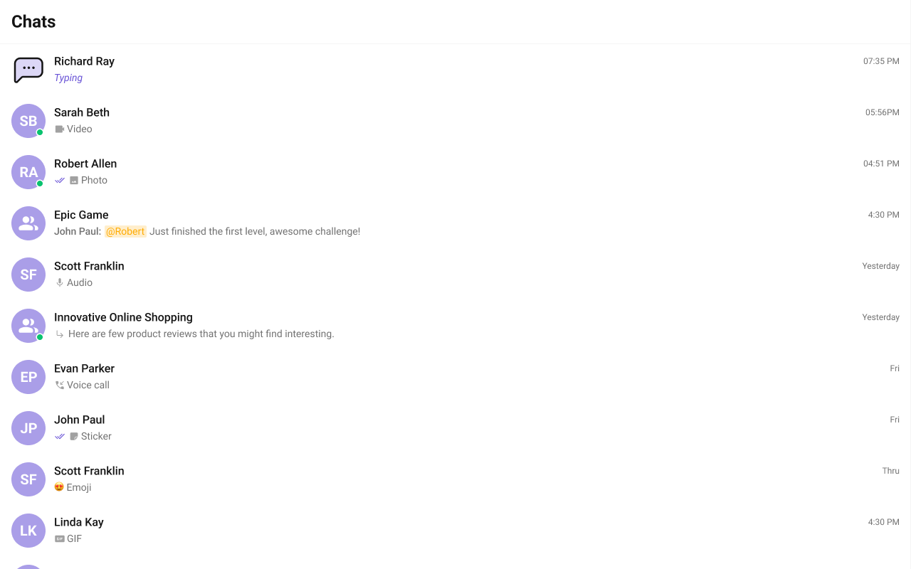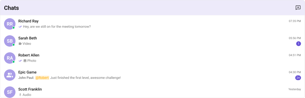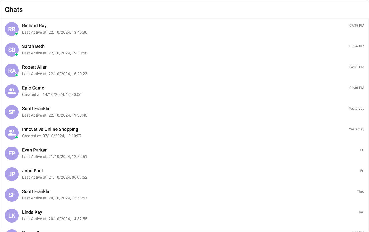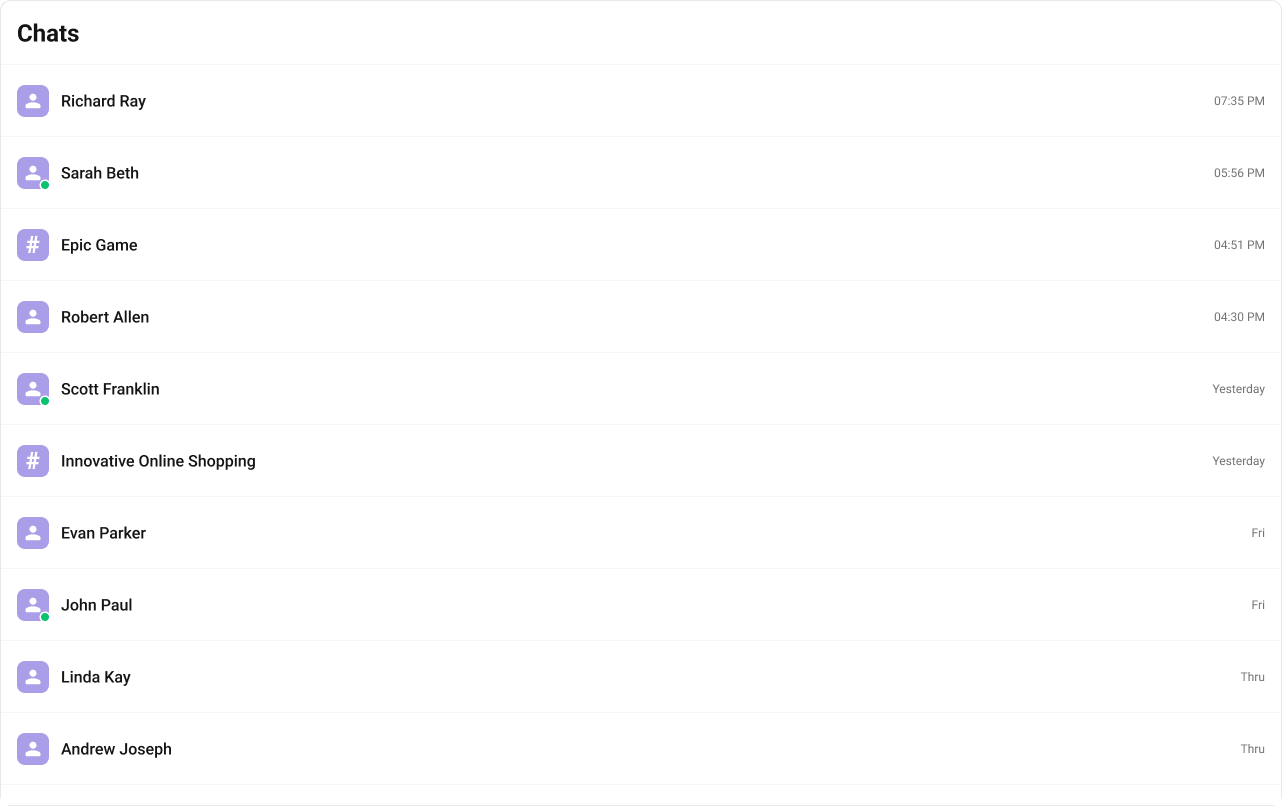onUserOnline / onUserOffline | Updates online/offline status dot (unless hideUserStatus={true}) |