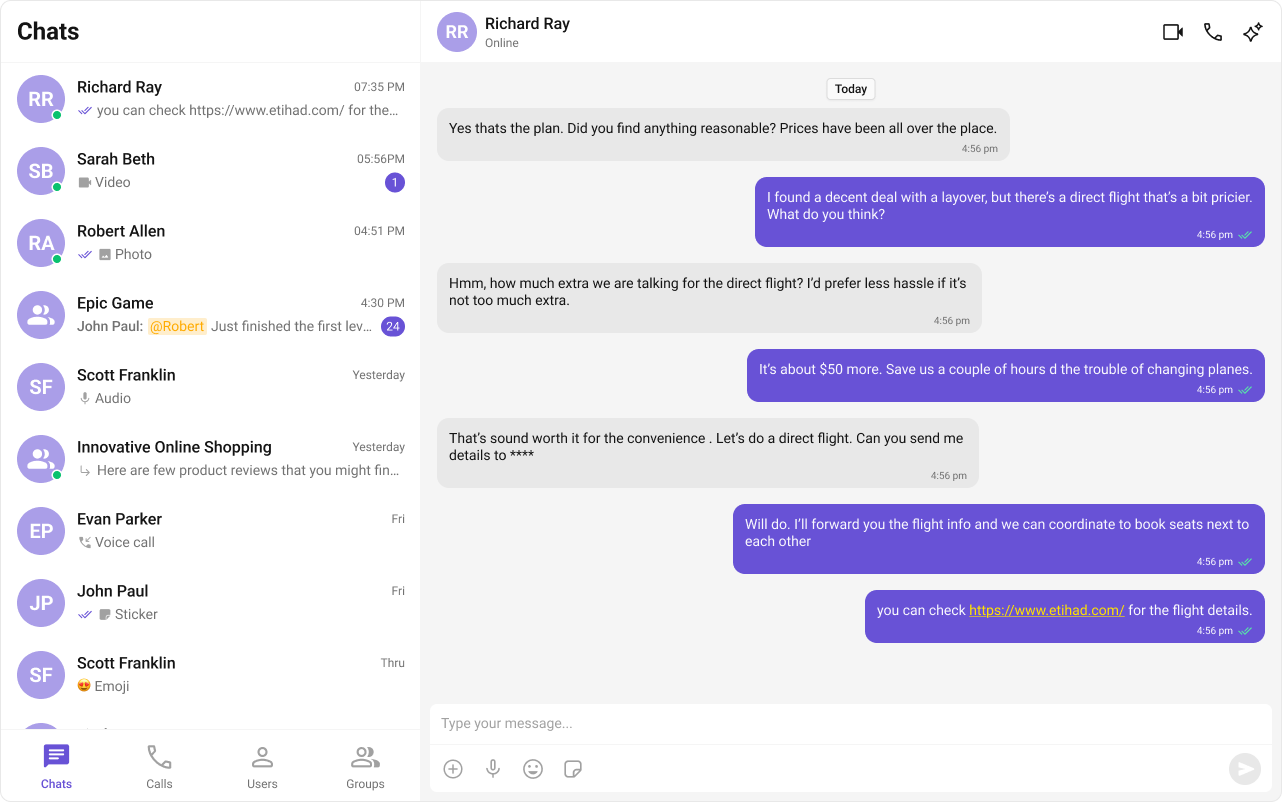 | Layout | Tabbed sidebar (Chats, Calls, Users, Groups) + message view |